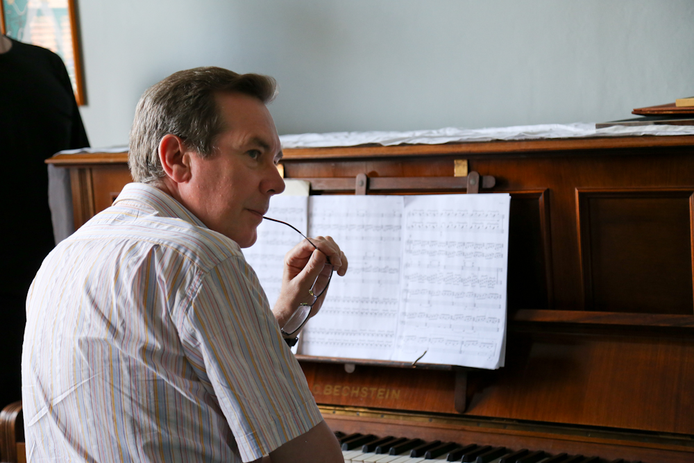 Nicola designed two episodes of puppetry – one to take place in Freddie’s old room where his toys have a last fling before tucking themselves away in a trunk, all underscored with recordings of the 10-year-old Freddie singing; the other as part of a taut scene in which Mary Anne talks about her grandfather playing piano while Philip plays Glass and our family photographs fly through the air to land on top of his piano.