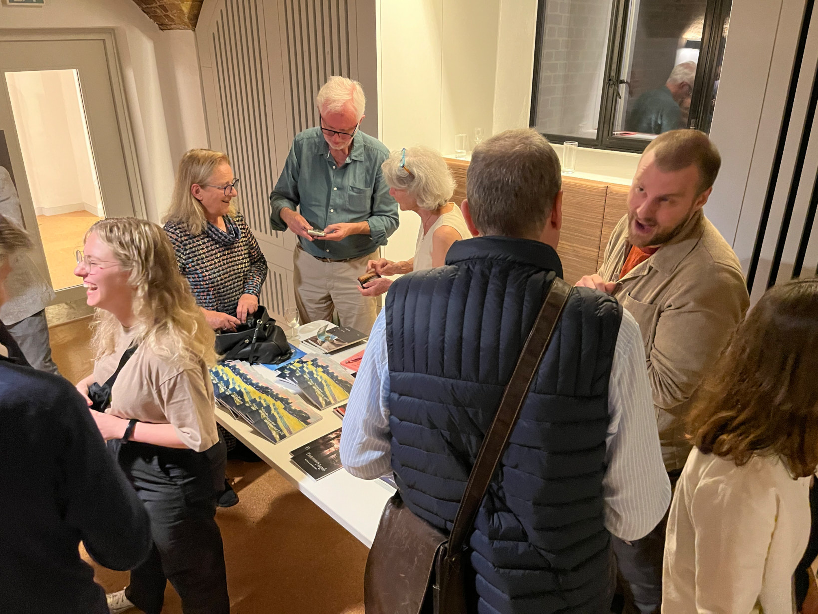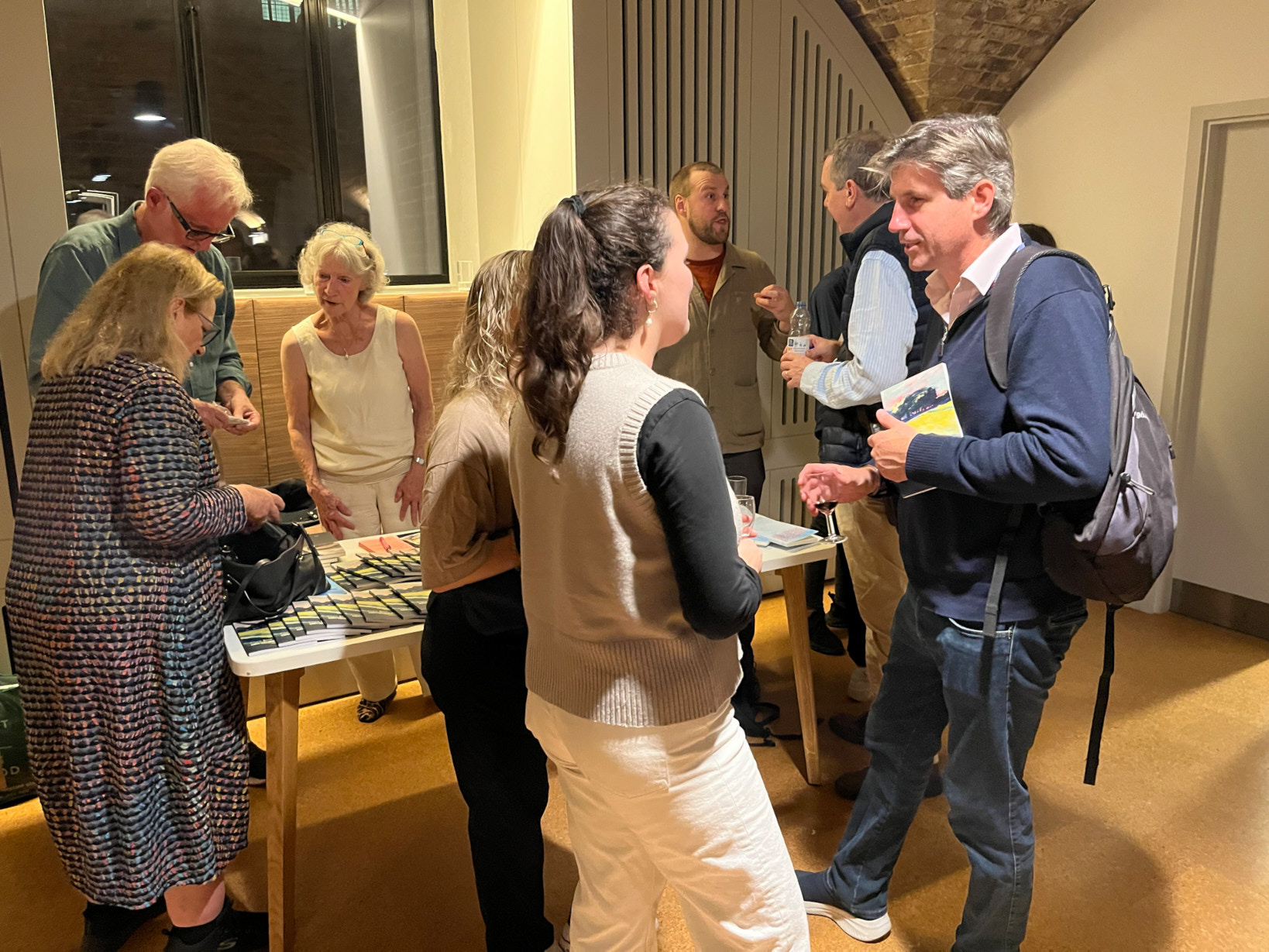 I start texting Freddie and other members of the team: Might be a bit late for 6 pm set-up. At that stage we still assume we’ll soon be free of the traffic and will drive all the way. But by 4.30 pm, not having moved more than a few yards, we need a Plan B. Train from Colchester. That’ll work, though we’ll have to leave most of the stuff in the car. Take the books, ask the team at St John’s to bring in wine etc for sixty guests.